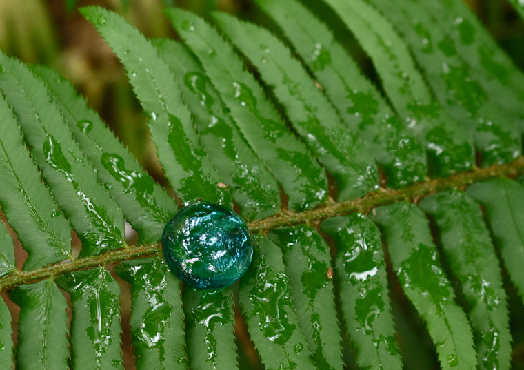 We headed south for a cache this morning, breakfast at The Kettle, but made up for it by a walk around the lake in Nolte State Park. On the hike out, we met a couple of women who were sprinkling sparkly glass gems along the trail, getting ready for a pre-school group. We saw them all the way out, placed on stumps and mossy tree roots, and even balanced on fern fronds. The kids will have a fun hike.